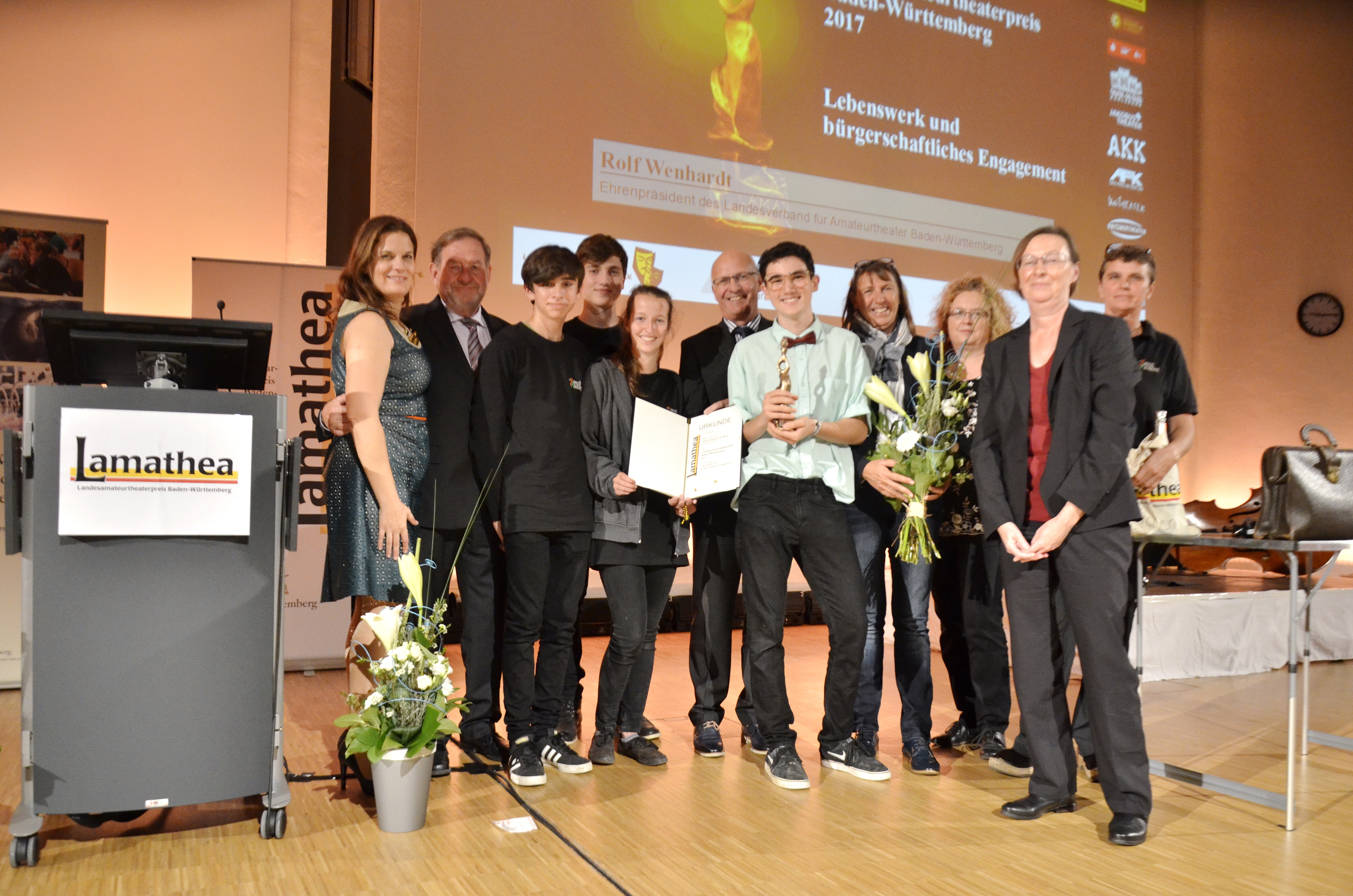 Landesamateurtheater-Preis Baden Württemberg 2017 der Kategorie "Lebenswerk und Bürgerschaftliches Engagement" geht an die Bodensee Schule St. Martin in Friedrichshafen. Die ZirkusAkademie umrahmte die Zeremonie feierlich mit Ball-Jonglage und Feuershow.
